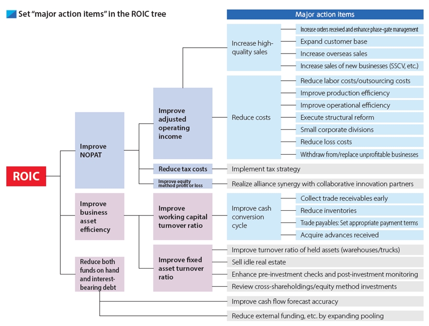 In FY2020, we prepared/distributed/explained an English version of documents which clearly describe the ROIC concept to accelerate the spread in overseas sites. We also set specific action items including "Expand sales," "Improve efficiency," and "Collect trade receivables early" in the ROIC tree budget reports which we prepared in FY2021. Going forward, we will strive to strengthen the concept of "ROIC reverse tree" which originates from sites and focuses on "what needs to be done at sites to improve ROIC" and aim to further spread it. We will also focus on improving ROIC through topline growth so as not to result in contracted equilibrium. In addition, we are currently building a structure to centrally manage revenues and expenses by site such as logistics center with the core system toward introducing balance sheet management and ROIC by site for the future "evolution" of the ROIC management. Once such structure is completed, we will be able to automatically generate balance sheets and profit and loss statement by site, and our initiatives to improve ROIC by site will progress significantly.