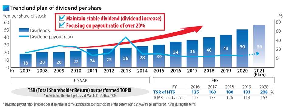 Going forward, our basic policy of dividends is to seek to maintain stable distribution linked to business performance, while considering medium-to-long-term business expansion and securing internal reserves to strengthen corporate structure. Under the policy, we aim to continue stable dividend payments (dividend increase) while securing funds for our growth.