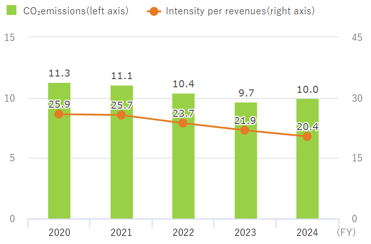 CO₂ emissions (ten thousand tons-CO₂) / Intensity per revenues (tons-CO₂/100 million yen)