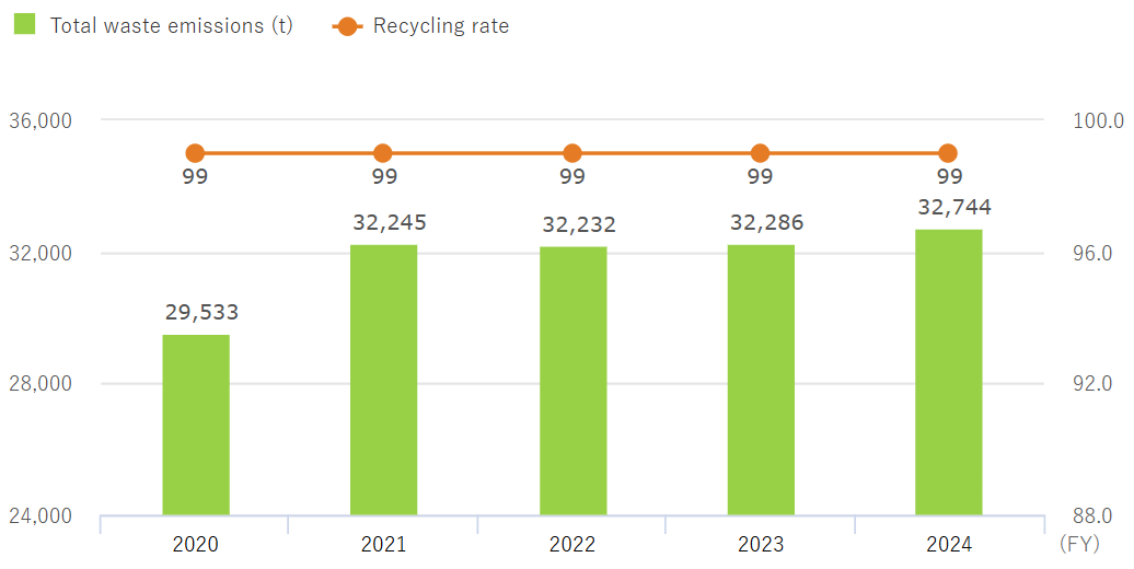 We are promoting measures to control waste emissions and reduce the amount of landfill disposal to maintain a recycling rate of 99%.