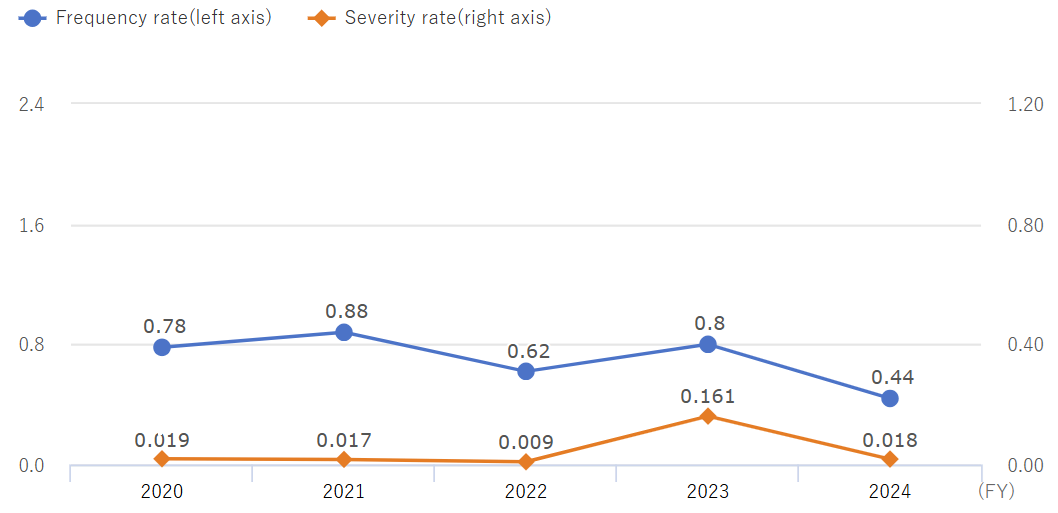 We lowered both the "frequency rate" representing the frequency of occurrence of workplace accidents and the "severity rate" representing the degree of severity of accidents by strengthening various safety measures in FY2024.