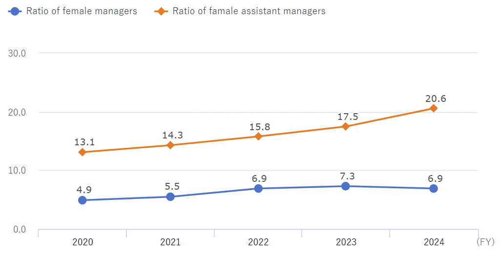 We are promoting the systematic development of female employees through various training programs, with the aim of increasing the ratio of female managers and assistant managers.