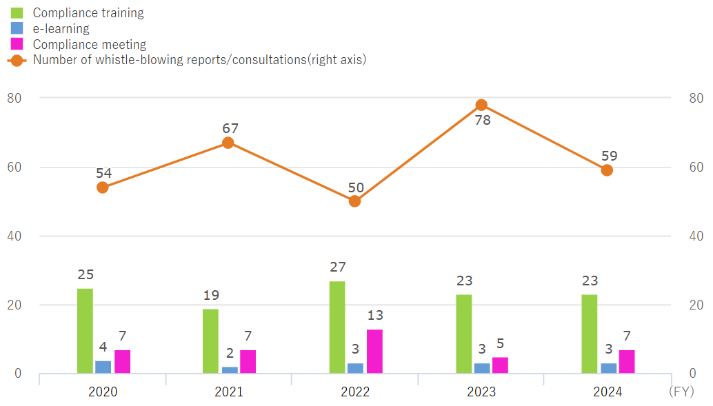 We are continuously implementing measures to strengthen compliance throughout the entire group in Japan and overseas. In FY2023, the number of whistle-blowing reports increased due to thorough protection of whistleblowers and increased awareness and dissemination of the whistleblowing system. However, in FY2024, the number of reports decreased.