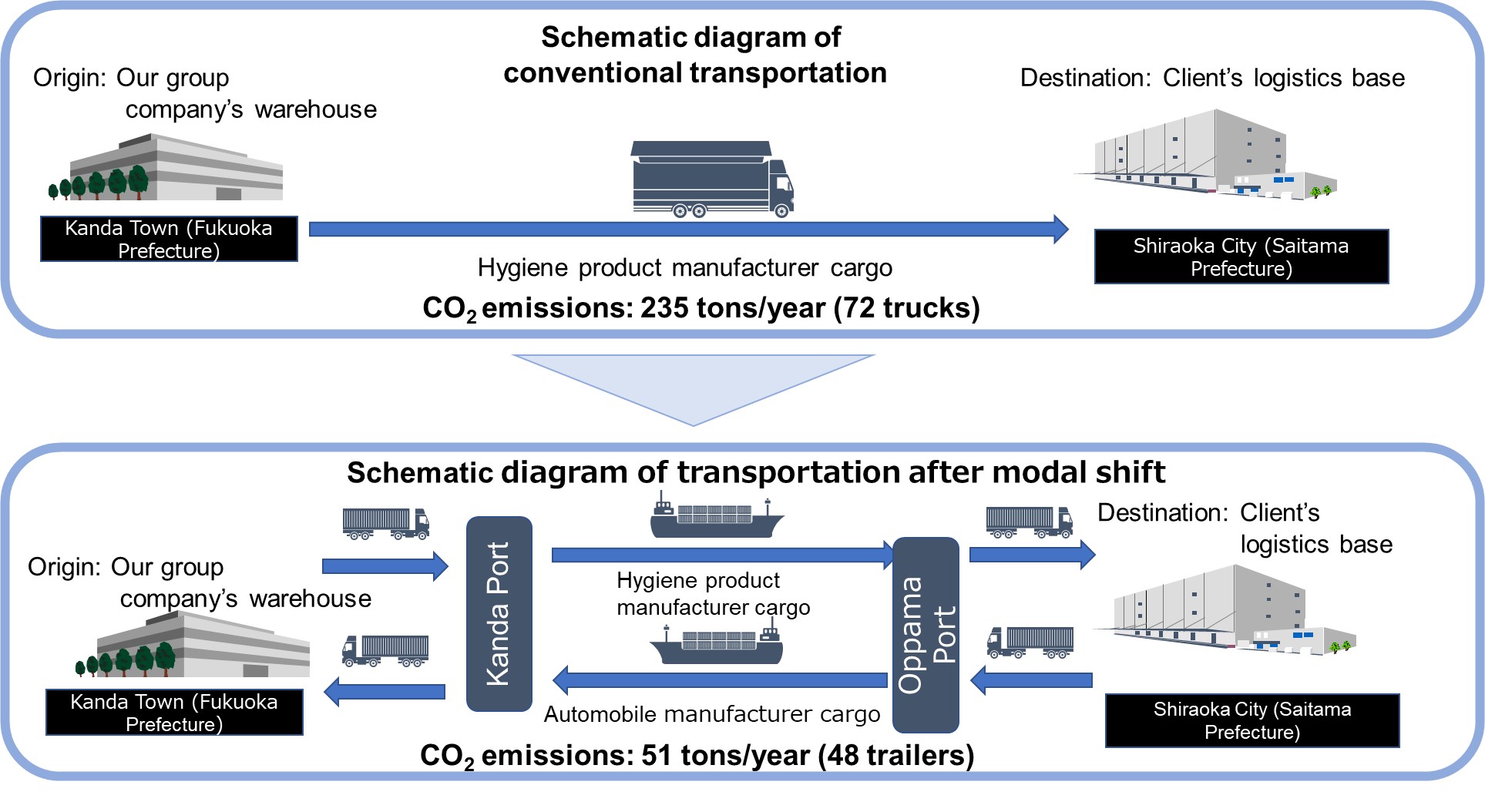 Our client, a manufacturer of hygiene products, ships products from its plant in Kyushu throughout Japan and overseas. It is concerned about a shortage of drivers and vehicles, especially for deliveries to the Kanto region. In response to this situation, we proposed a modal shift from conventional truck transportation to coastal shipping. We utilized the return load scheme from Kanto to Kyushu operated by VANTEC CORPORATION, one of our group companies and we promoted it together with client.