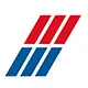 赤は「活力」、青は「着実」を表します。左右3区分は、陸・海・空 三位一体となった「グローバルな業態」、輸送・保管・情報等の「トータル物流システム」を表します。上下2区分は、お客さま・取引先と当社グループの「パートナーシップ」を表します。