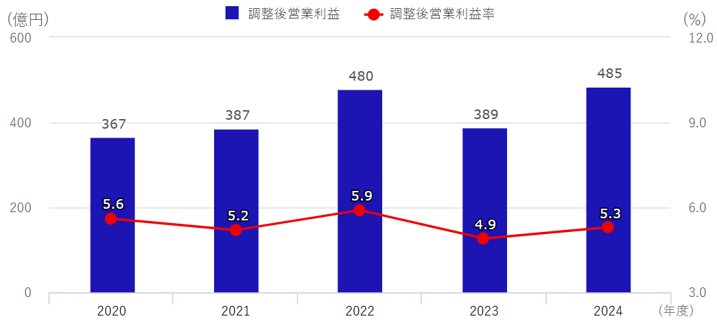 ※「調整後営業利益」は、2023年度より、営業利益から「その他の収益」を減算し、「その他の費用」、「企業結合により識別した無形資産の償却費」及び「株式報酬費用」(業績連動型株式報酬制度に係るものを除く)を加算して算出しており、2022年度実績は当該変更を反映しています。
