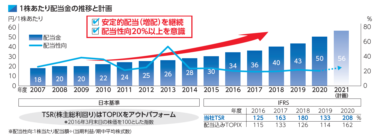 当社は引き続き、中長期的視野に基づく事業展開を考慮し、内部留保の充実によって企業体質の強化を図りつつ、安定的な配当の継続に加え、業績に連動した利益還元に努めることを利益配分の基本方針としていきます。この方針のもと、成長のための資金を確保しつつ、安定的な配当(増配)を継続することに努めていきます。