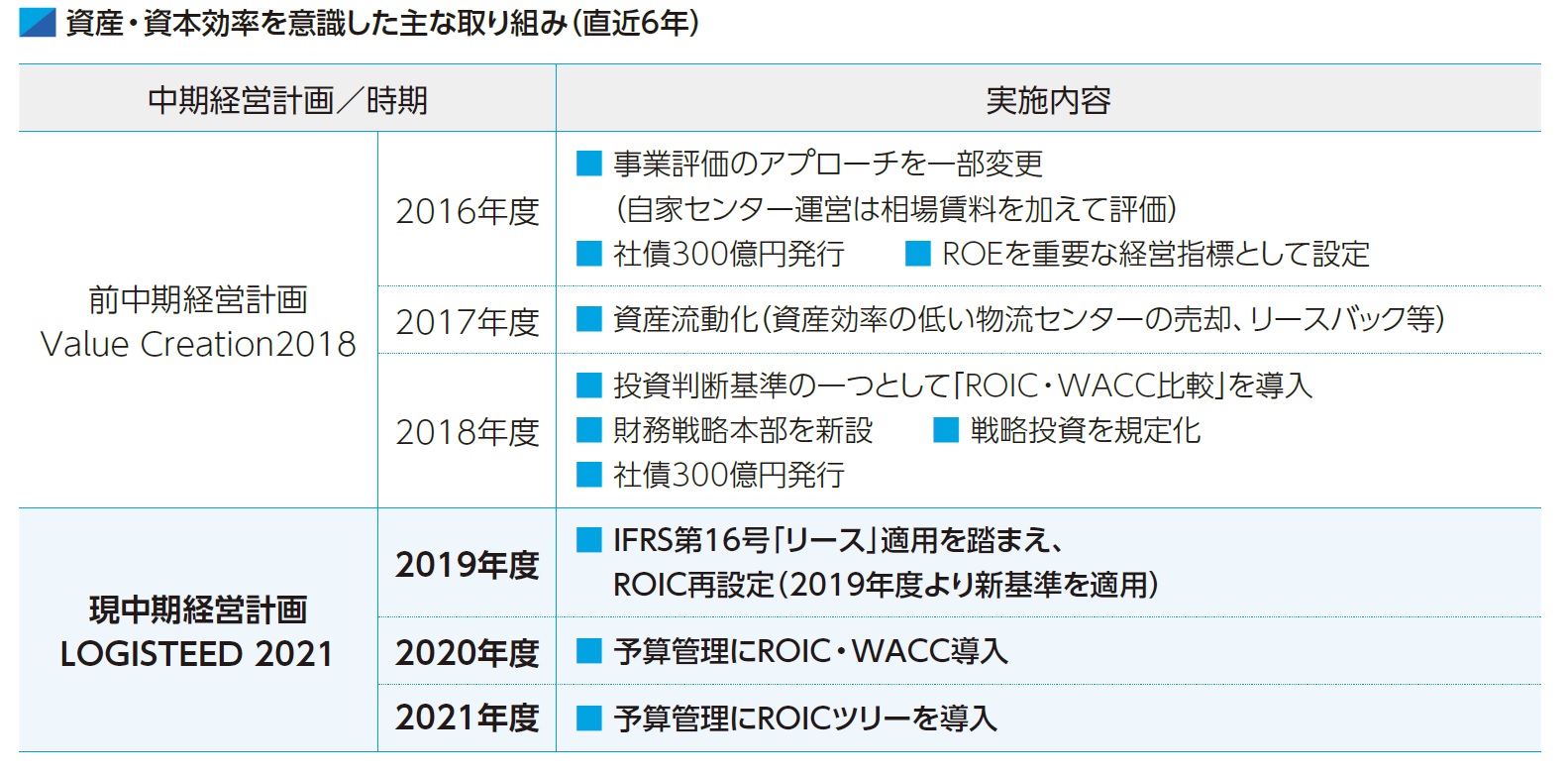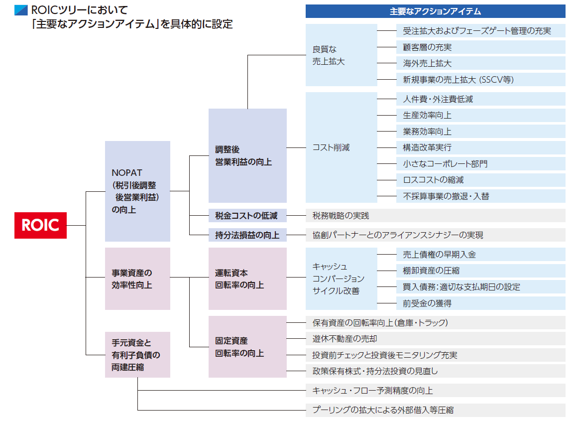 今後は、「現場で何をすればROICが上がるのか」という現場起点の「ROIC逆ツリー」の考え方を強化しながらさらなる浸透を図るほか、縮小均衡に陥ることがないよう、トップラインの拡大による成長を前提としたROIC改善への取り組みに注力します。