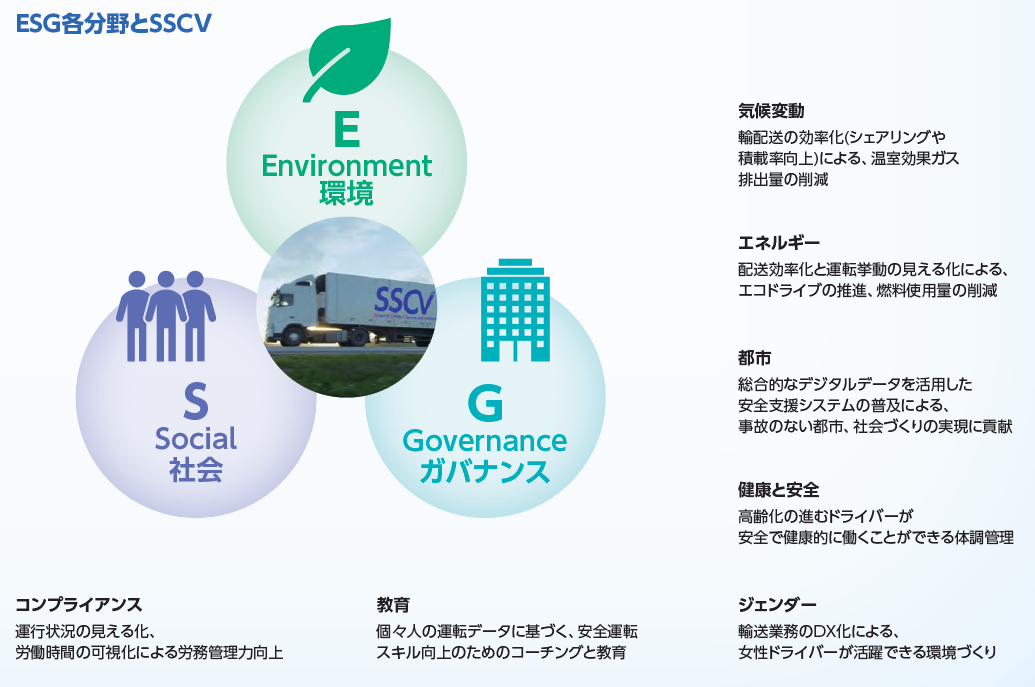 後藤:SDGsへの貢献の点でいえば、SSCVが提供する価値は、短期間のうちに創出できるものと、中長期的に創出できるものがあると考えています。短期間で創出できるものは、Smartによる業務効率の向上と法令遵守、Safetyでの安全性の向上等です。中長期的には、エコドライブの実現によるCO2の排出量削減や、従業員の健康意識の向上、健康経営の実践等が若年層や女性のドライバー志望者の増加を促し、輸送業界全体のダイバーシティの推進につながって欲しいと思います。