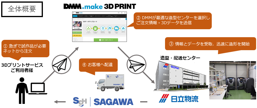 今般、DMM.makeが受注した製品情報をもとに、当社物流センター内に設置した3D プリンターで生産した完成品を同一拠点で佐川急便に引き渡し、配送サービスを提供することで、従来は物理的な制約で対応が難しかった首都圏への短期納品を実現いたします。