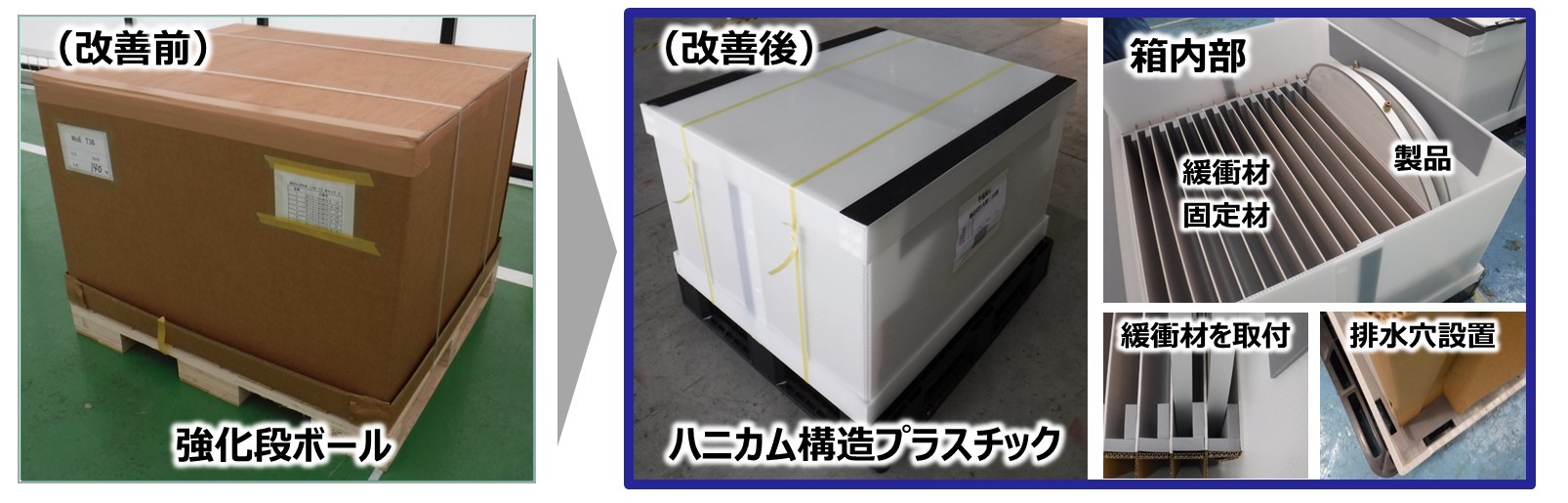当社が開発した「電車部品の通函」は、箱外装に、高強度ハニカム構造プラスチック材料 ※(ハニカム構造:ハチの巣構造)を採用することにより、従来の強化段ボールに比べ、約3倍の強度を確保。材料の表面強度が増したことにより、前工程における箱内面への緩衝材・固定材等の直接貼付処理が可能となりました。その結果、包装作業が製品を箱に入れて蓋をするのみとなり、約50%の作業工数の削減が可能となりました。箱底面には排水穴を設置することにより、浸水による製品ダメージを防ぎ、箱本体の耐水性もさらに向上しています。また、繰り返し使用できるため、環境にも配慮した仕様となっています。