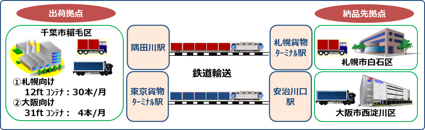 今回受賞した当社の取り組みは、東京都から北海道および大阪府への店舗向け用品輸送において、鉄道コンテナ輸送を実現し、輸送効率の向上とドライバーの負荷軽減を実現したものです。鉄道コンテナ輸送の実現にあたっては、鉄道コンテナのダイヤに合わせた倉庫内作業の設計を行うとともに、特に北海道向け輸送においては、運行遅延・運休等への航空輸送でのバックアップ体制も構築し進めてまいりました。