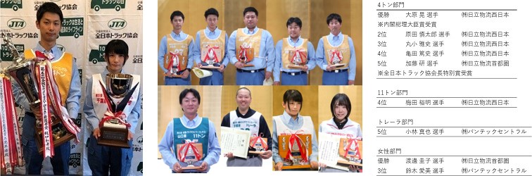 また、女性部門では渡邊圭子選手(㈱日立物流首都圏)が優勝するとともに、3位にも入賞しました。11トン部門では4位に入賞、トレーラ部門では5位に入賞するなど、合計で9名の選手が上位入賞となる好成績をおさめました。