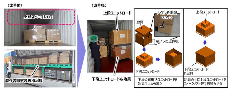 従来、異形状ユニットロードは平積(非段積)を余儀なくされ、コンテナ内の上部スペースにロスが生じていました。また、鋼材製の段積治具は高価であり、リターン運用が前提で、再輸出・再輸入免税手続き、保管費用、盗難リスク、煩雑な運用管理などが課題でした。これらを解決し、普及を図るため、鋼材製よりも安価な強化段ボール製のワンウェイ段積治具を開発した結果、積載効率は従来比2倍、コストは従来比40%低減を実現しました。加えて積載効率が向上することで二酸化炭素排出量削減効果も期待できます。