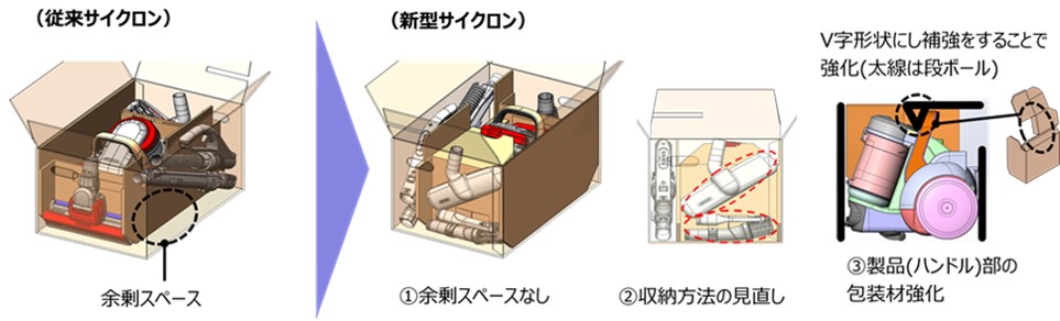 新型サイクロン(掃除機)の包装開発にあたり、被包装体の脆弱部保護手法見直しも含む、新たな改善に取り組みました。余剰スペースの活用と収納・配置方法見直しによる梱包箱の縮小化を図り、さらにV字形状の段ボールで補強をすることで品質レベルを維持しました。その結果、従来比で包装サイズ20%縮小、材料費17%低減、トラック積載台数33%拡大、輸送費25%低減、二酸化炭素排出量27%低減を実現しました。