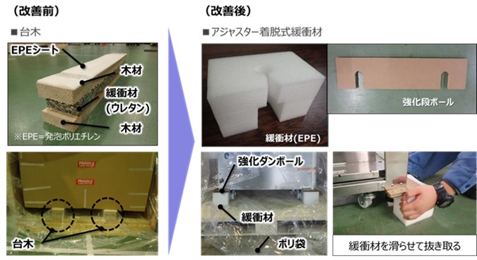 これらを解消するため、EPE(発泡ポリエチレン)と強化ダンボールを用いた着脱式緩衝材を採用した結果、作業員が1名で緩衝材を製品アジャスターから滑らせて抜き取ることができるようになり、作業の安全性向上と作業時間を75%短縮することができました。さらに、材料とその形状を変更したことにより廃材重量93%削減を実現しています。
