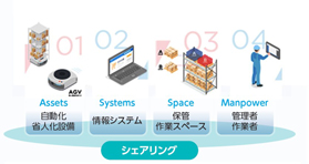 スマートウエアハウスは、①複数のEC事業者の物流作業を1つのプラットフォームで運営することで、②自動化・省人化設備、情報システム、保管・作業スペース、管理者・作業者をシェアリングするとともに、③EC物流に必要なデータ連携、在庫保管、梱包業務、発送業務をパッケージで提供できることが特徴です。