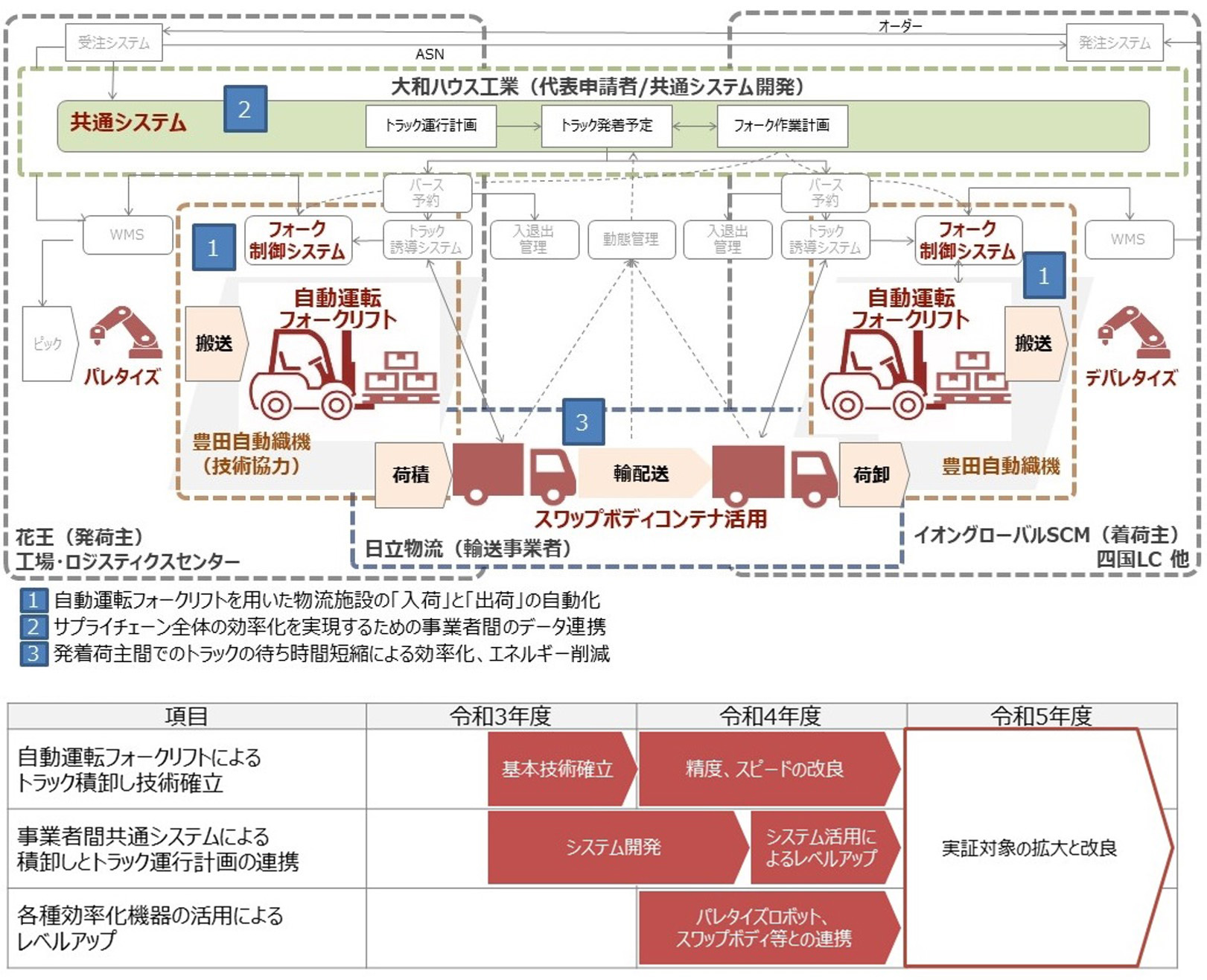 大和ハウス工業株式会社(本社:大阪市北区、代表取締役社長:芳井 敬一)とイオングローバルSCM株式会社(本社:千葉市美浜区、代表取締役社長:野澤 知広)、花王株式会社(本社:東京都中央区、代表取締役 社長執行役員:長谷部 佳宏)、株式会社日立物流(本社:東京都中央区、代表執行役社長:中谷 康夫)、株式会社豊田自動織機(本社:愛知県刈谷市、取締役社長:大西 朗)の5社は、経済産業省資源エネルギー庁公募事業である令和3年度「AI・IoT等を活用した更なる輸送効率化推進事業」※1において、物流施設でのAIを搭載した自動運転フォークリフト等を活用し、トラック運行と連携させることで、荷役効率化・物流効率化・省エネ化に取り組む共同事業の提案が採択され、2021年9月16日に交付決定※2されました。
