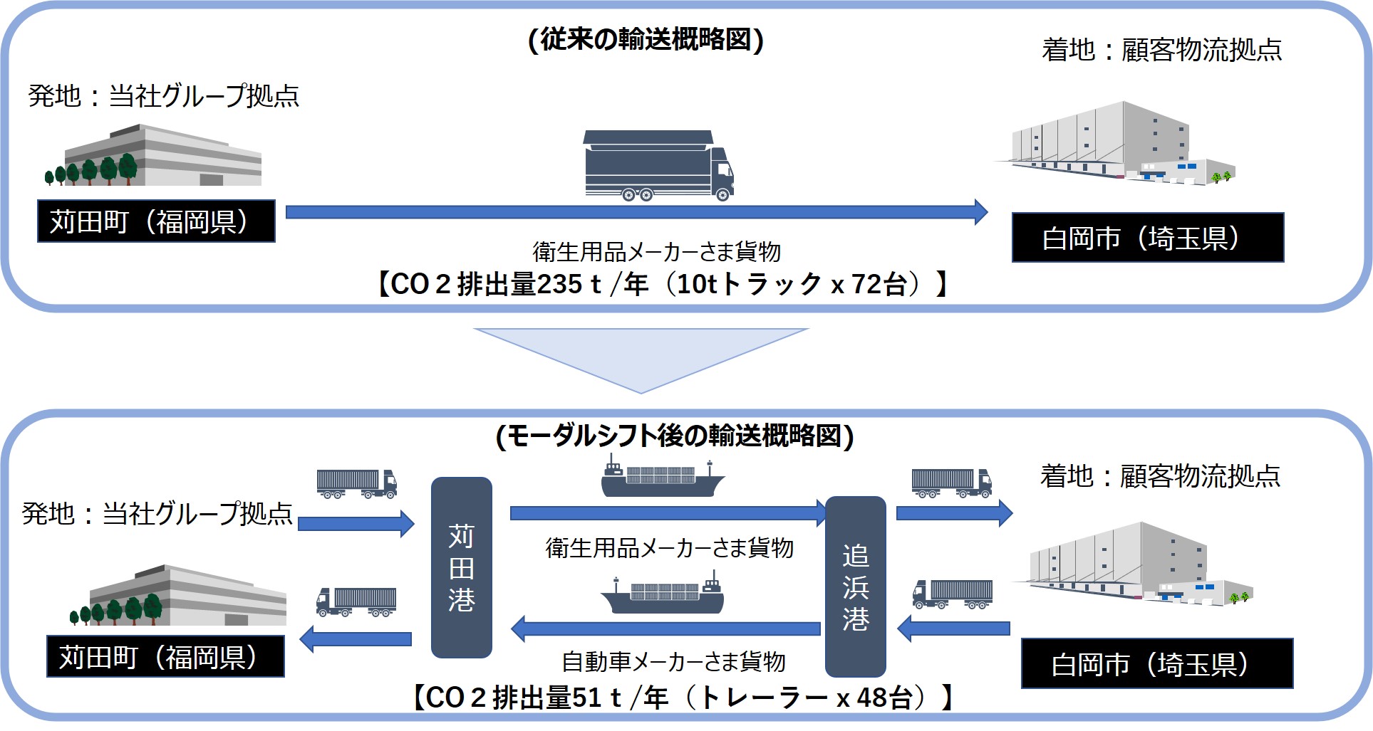 当社顧客の衛生用品メーカーさまは、九州の工場から海外、日本全国へ製品を出荷していますが、特に関東地方向け配送のドライバー不足、車両不足を危惧されていました。そこで、当社グループの株式会社バンテックが行っている自動車メーカーさまの関東発九州向けの帰り荷スキームを活用した、従来のトラック輸送から内航船へのモーダルシフトを提案し、お客さまとともに推進しました。
