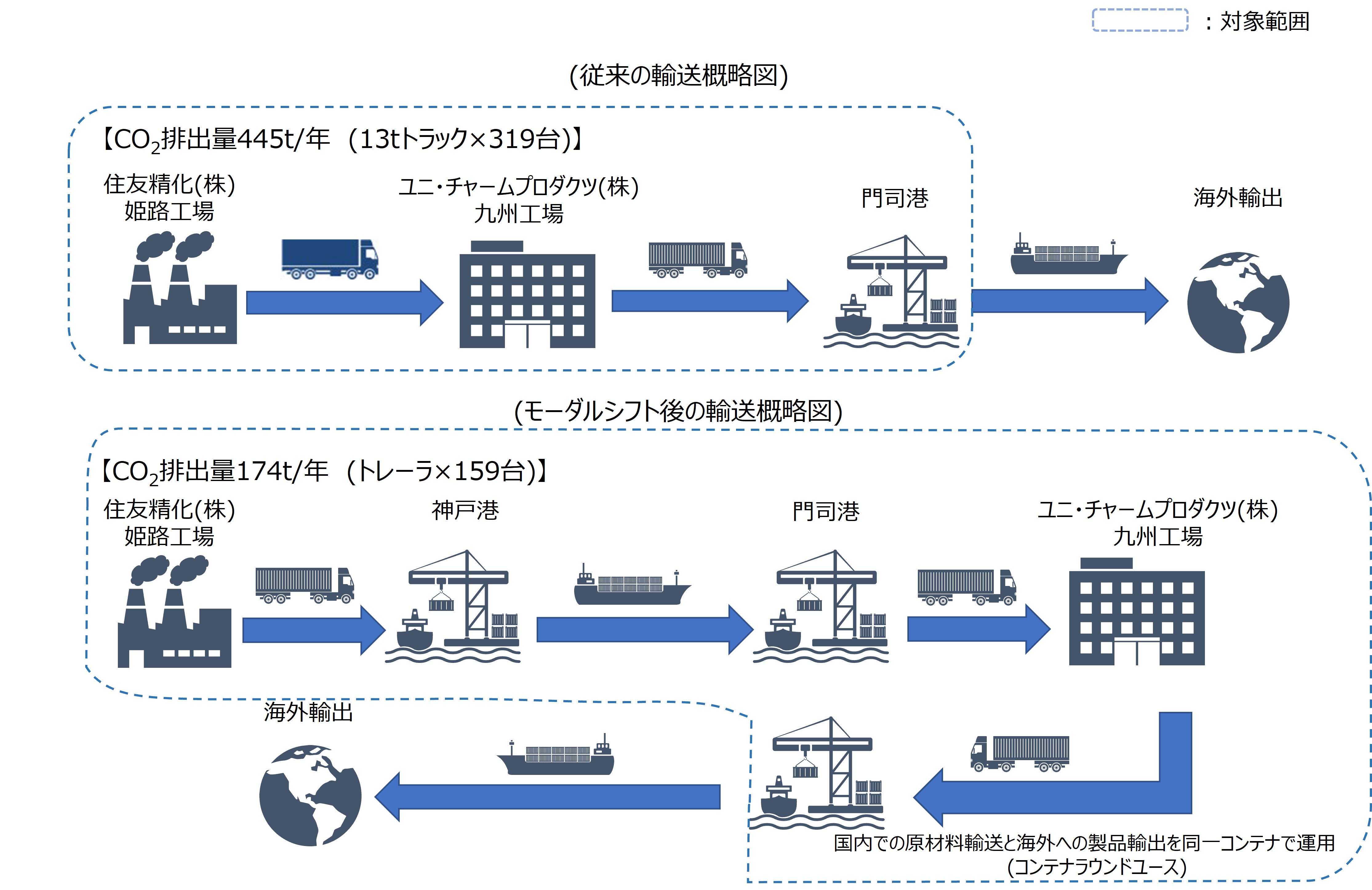 従来、住友精化(株)姫路工場からユニ・チャームプロダクツ(株)九州工場間の原材料輸送は、全行程をトラックで輸送しており、将来にわたるトラックドライバーの安定確保と環境負荷の低減に取り組む必要がありました。そこで、神戸港~門司港間を内航船活用による輸送へモーダルシフトすることで、トラックの長距離輸送をなくし、安定輸送の確保とトラックドライバーの負荷軽減、CO2排出量の削減を実現しました。また、輸出用の海上コンテナを国内輸送に転用(コンテナラウンドユース)することで、輸送車両の大型化により運行回数を削減し、輸送の効率化を図りました。さらに、輸出製品積込作業に自動バンニングマシンを導入し、作業時間の削減を行いました。
