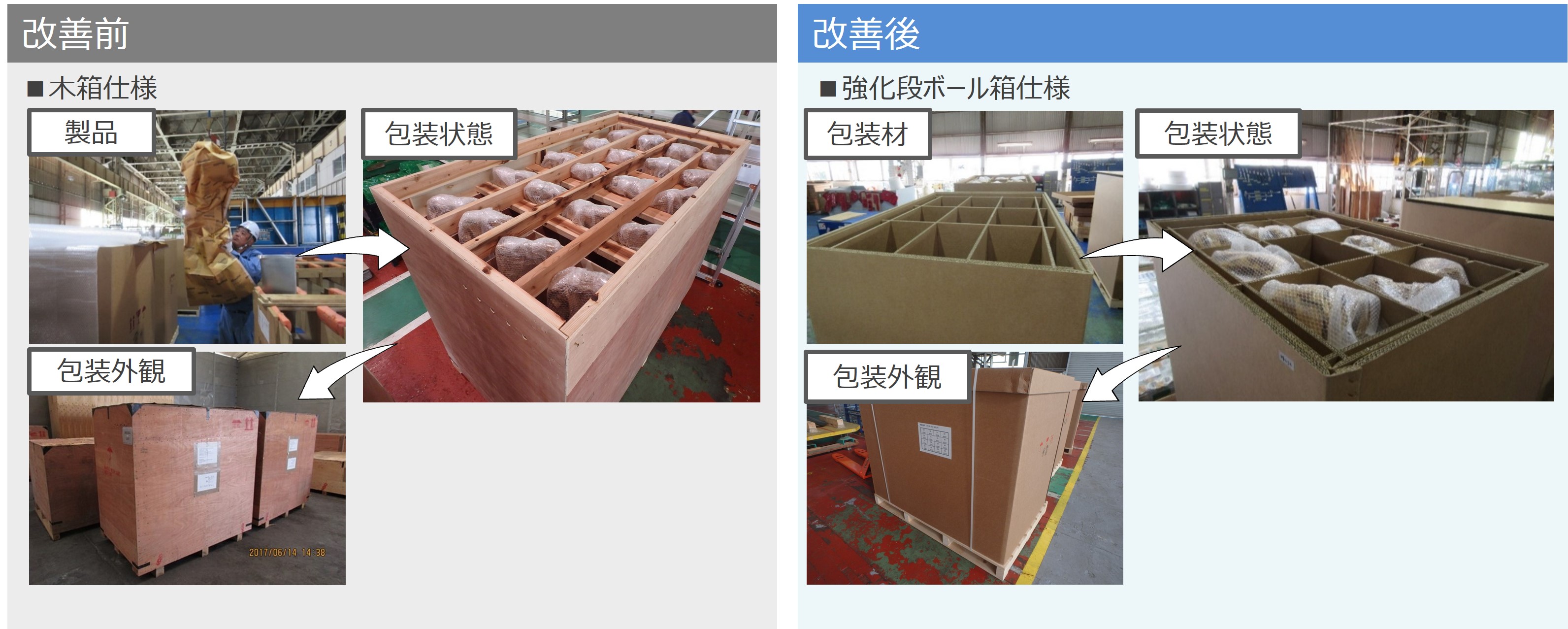 従来の木箱包装は、梱包重量が大きく輸送費が高くなることや、梱包・開梱作業時に多くの作業員と作業時間を要するなど、コスト・作業効率の面で課題を抱えていました。そこで、木箱包装から、木材パレットの上に強化段ボールの包装箱を置き、製品格納後にキャップを被せる仕様に変更しました。新仕様では、梱包・開梱に掛かる作業時間を従来比で20%削減し作業効率を向上させるとともに、包装材の大半を強化段ボールとしたことにより、梱包を軽量化し輸送コストを60%削減しています。さらに、輸送箱廃棄時のCO2排出量を88%削減させることができ、環境にも配慮した包装を実現しました。