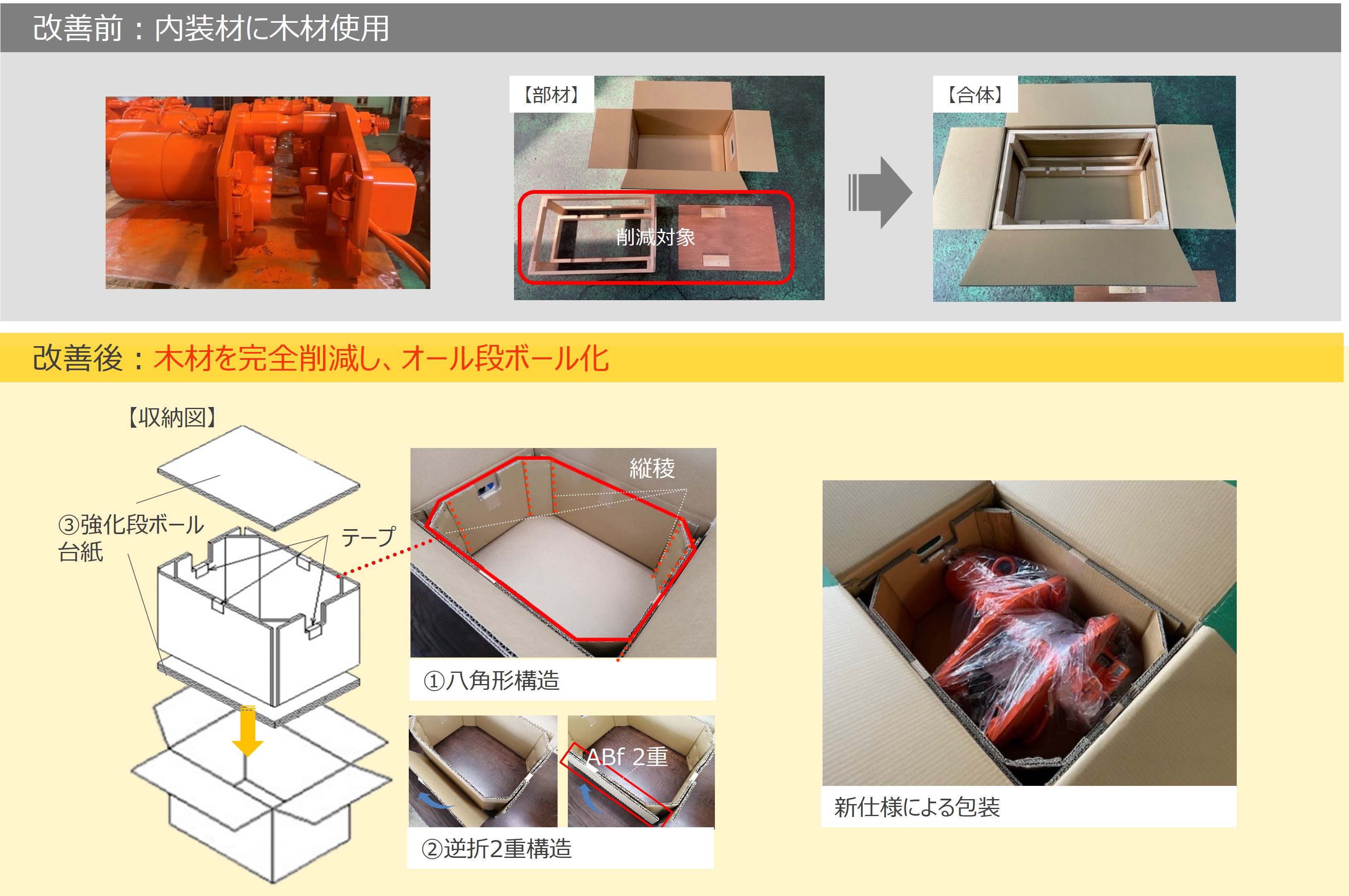 従来は外箱を段ボール、内装材に木材を使用していましたが、環境負荷低減の観点から、木材を使わないオール段ボール化による包装を開発しました。オール段ボール化にあたっては、製品重量を考慮し、内装材に木材と同様の機能と強度を持たせることが課題となります。そこで、内装材の四隅を八角形構造とし耐圧機能を持たせ、さらに内装材段ボールのふた部分を逆折りにして、側面を2重構造とすることで厚みを出し、耐圧強度を高めました。また、持ち上げた際の底抜け防止のため、底面に強化段ボールの台紙を採用し、従来同様の機能と強度を持った包装を実現しました。このオール段ボール化によって、木材使用量を100%削減するとともに、材料費を従来比で20%削減しています。