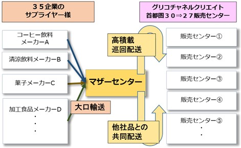 首都圏における「オフィスグリコ」の製品供給は、これまでサプライヤー各社が首都圏に30あるグリコチャネルクリエイトの販売センターへそれぞれ高頻度の小口配送をしており、荷降ろしも手作業で行うため作業者への負担がかかっていました。今回、マザーセンターを立ち上げ、マザーセンターから各販売センターに巡回配送する方法に変更したことで、納品頻度を高めながら、配送車両の大幅な台数削減とCO₂排出量削減を実現しました。また、販売センターで余分な在庫保管が不要になり、空いたスペースに近隣の販売センターの在庫を保管するなど、販売センターの集約にもつながりました。荷役作業効率を考慮し、マザーセンターへの納品はパレット、マザーセンターから各販売センターへはカゴ台車を使用することで、荷降ろしの手作業と時間を削減しました。さらに、一部エリアでは他社製品と共同配送を行うことで、配送効率の向上を図っています。